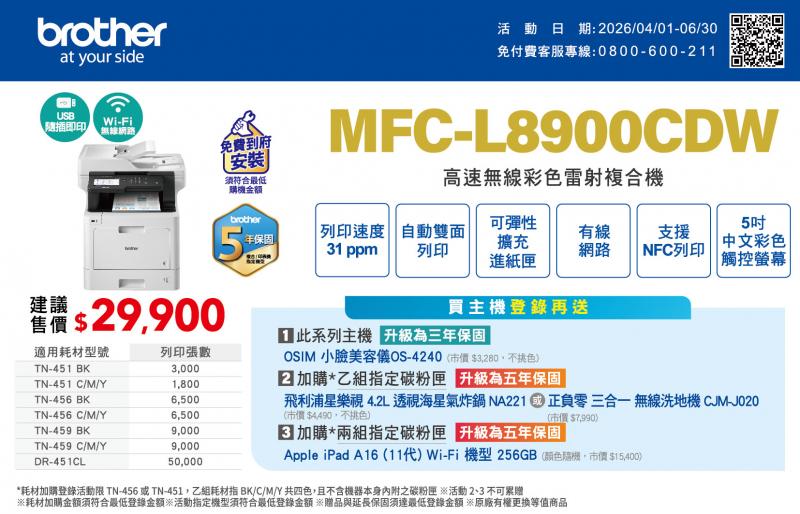 3. 買此系列主機,加購兩組 CMYK 碳粉匣(限 TN451 或 TN456),登錄可獲得 Apple iPad A16(11 代) 256G Wi-Fi (顏色隨機,市價 NT $15,400) ,並升級為五年保固