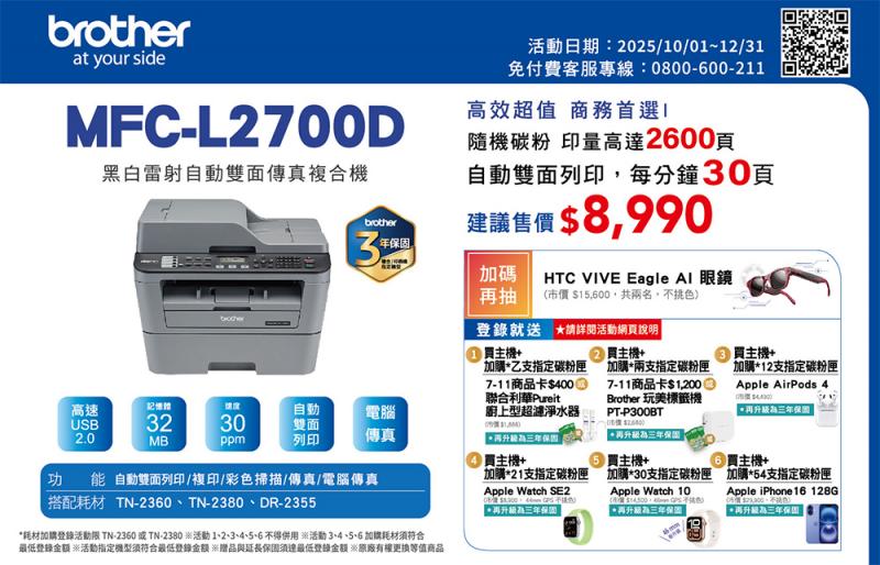升級三年保固送好禮,再抽 HTC VIVE Eagle AI 眼鏡(市價 NTD $15,600, 不挑色)共兩名(HL-L2320D、DCP-L2540DW、MFC-L2700D)