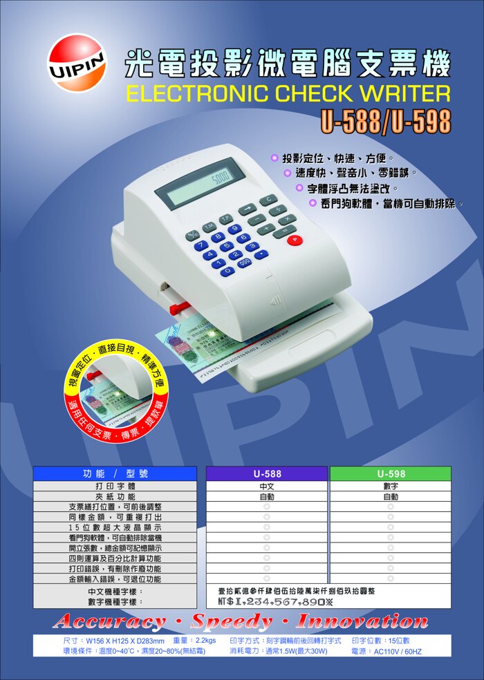 【UIPIN】光電投影微電腦支票機 U-598 (數字型)