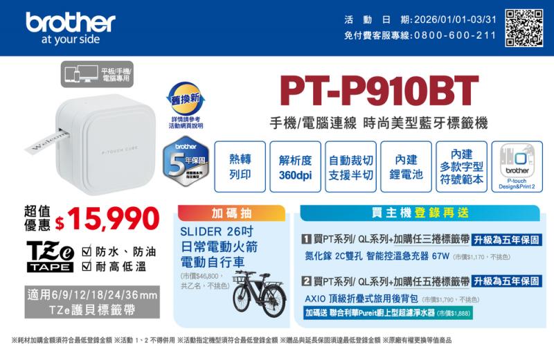 1. 購買 PT-D460BT 或 PT-D610BT,上網登錄就送 5 捲標籤帶(市價超過 NT $2,000)