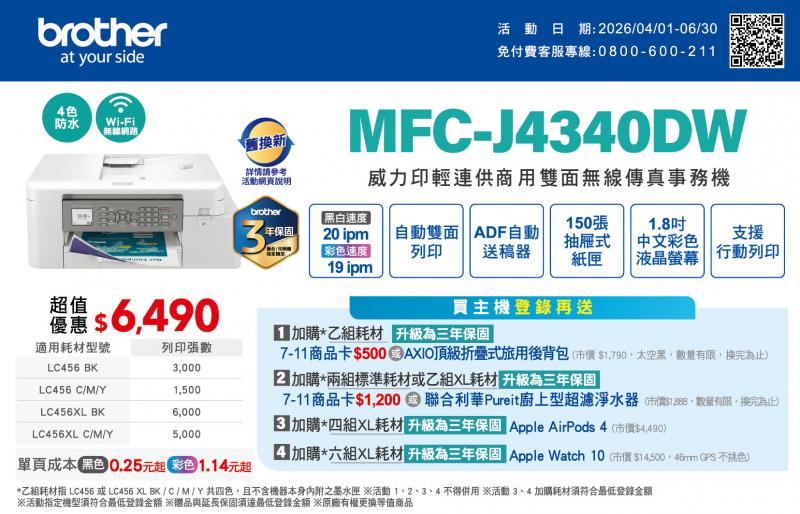 3. 購買 MFC-J4540DW 或 MFC-J4340DW 主機,加購*四組 LC456XL 耗材,登錄可獲得 Apple AirPods 4(市價 NT $4,490),再升級為三年保固。