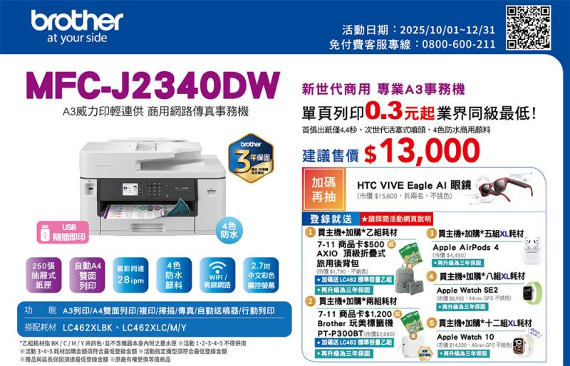 3. 購買 ^A3 威力印輕連供系列 (MFC-J2340DW 或 MFC-J3940DW),加購*五組 XL 大容量耗材,登錄並通過資格審核可獲得 AirPods 4 (市價 NT $4,490) , 再升級為三年保固。