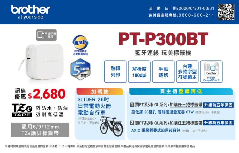 買指定標籤機,加購耗材送好禮,升級五年保固,再抽 SLIDER 日常電動火箭 26 吋帥氣紳士電動自行車(市價 NTD $46,800, 不挑色)共乙名