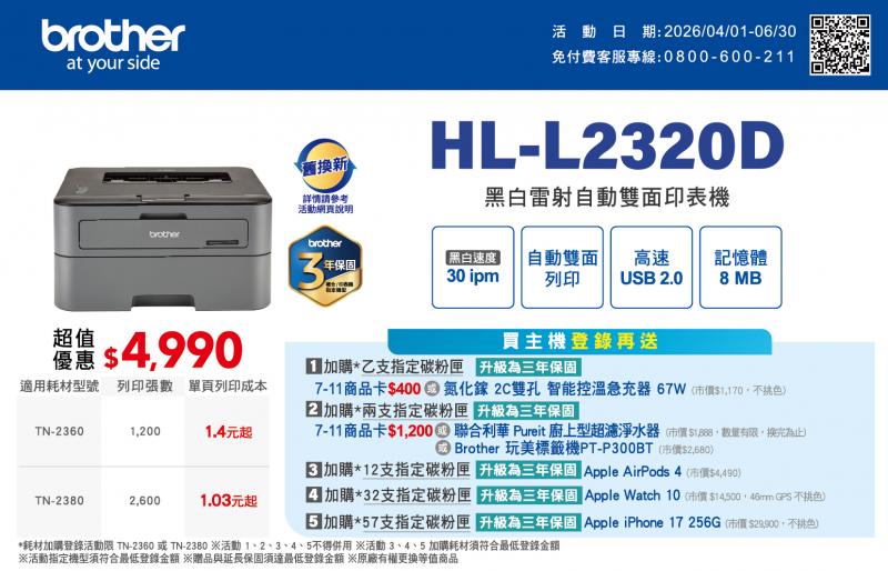 3. 購買此系列主機,加購 12 支碳粉(TN2360 or TN2380)可獲得 Apple AirPods 4(市價 NT $4,490),再升級為三年保固。