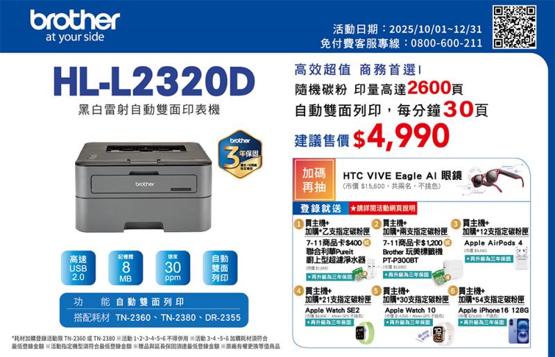 升級三年保固送好禮,再抽 HTC VIVE Eagle AI 眼鏡(市價 NTD $15,600, 不挑色)共兩名(HL-L2320D、DCP-L2540DW、MFC-L2700D)