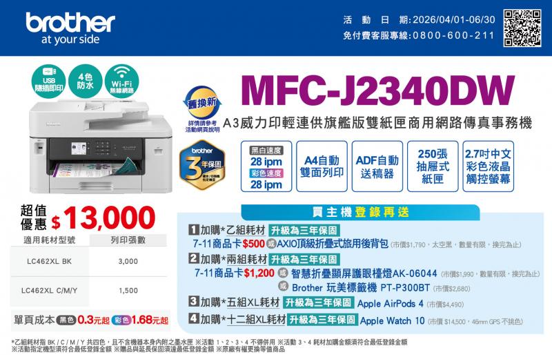 3. 購買^A3 威力印輕連供系列(MFC-J2340DW 或 MFC-J3940DW),加購*五組 XL 大容量耗材,登錄可獲得 Apple AirPods 4(市價 NT $4,490),再升級為三年保固。