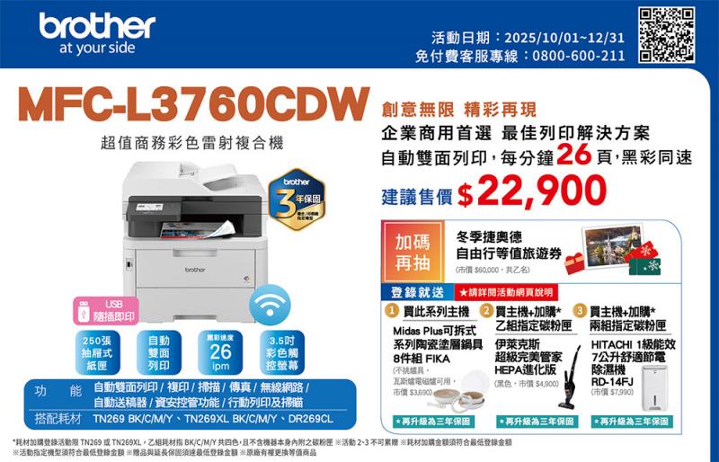 升級三年保固送好禮,再抽冬季捷奧德自由行等值旅遊券(市價 NT $60,000)共乙名(HL-L3280CDW、MFC-L3760CDW、MFC-L3780CDW)