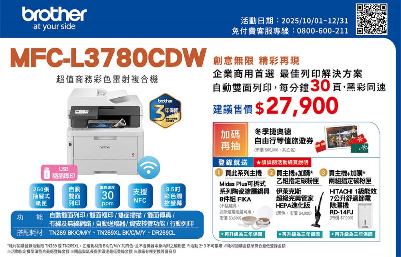 升級三年保固送好禮,再抽冬季捷奧德自由行等值旅遊券(市價 NT $60,000)共乙名(HL-L3280CDW、MFC-L3760CDW、MFC-L3780CDW)
