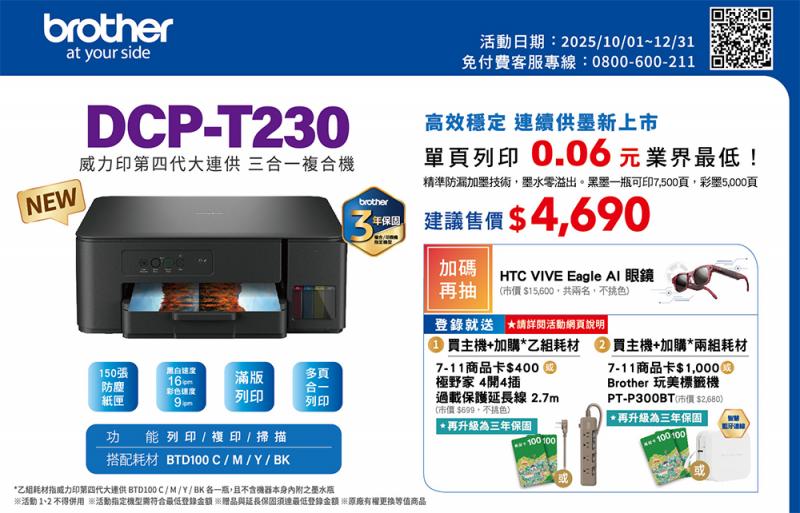 升級三年保固送好禮,再抽 HTC VIVE Eagle AI 眼鏡(市價 NTD $15,600, 不挑色)共兩名(MFC-T930DW、DCP-T830DW、DCP-T730DW、DCP-T535DW、DCP-T430W、DCP-T230)