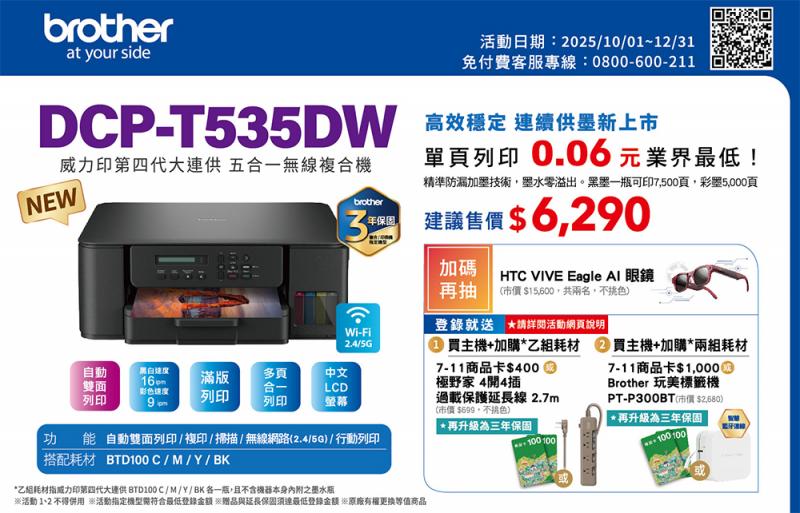 升級三年保固送好禮,再抽 HTC VIVE Eagle AI 眼鏡(市價 NTD $15,600, 不挑色)共兩名(MFC-T930DW、DCP-T830DW、DCP-T730DW、DCP-T535DW、DCP-T430W、DCP-T230)