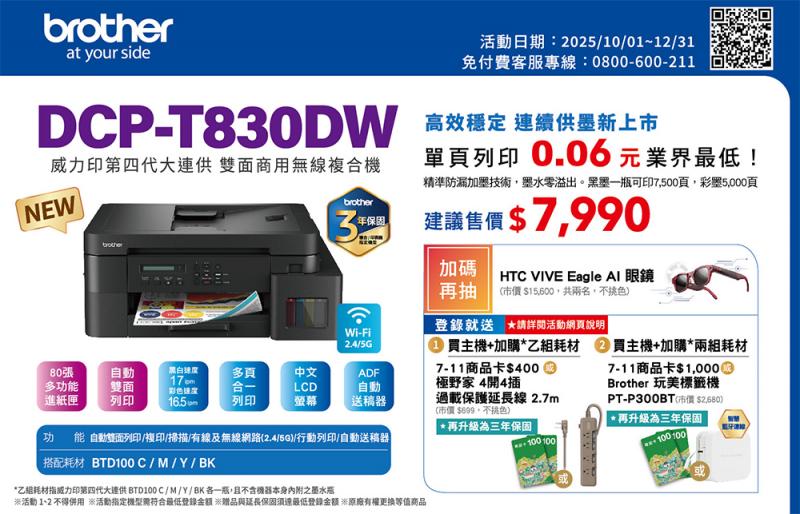升級三年保固送好禮,再抽 HTC VIVE Eagle AI 眼鏡(市價 NTD $15,600, 不挑色)共兩名(MFC-T930DW、DCP-T830DW、DCP-T730DW、DCP-T535DW、DCP-T430W、DCP-T230)