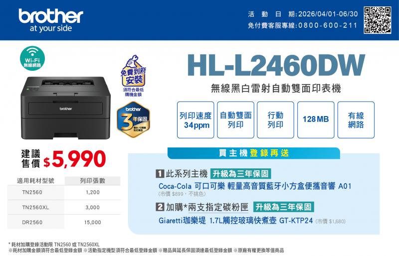 *耗材加購登錄活動限 TN2560、TN2560XL、TN2460 或 TN2480