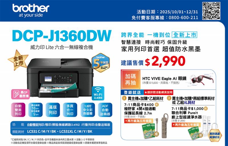 升級五年保固送好禮,再抽 HTC VIVE Eagle AI 眼鏡(市價 NTD $15,600, 不挑色)共兩名(DCP-J1360DW)