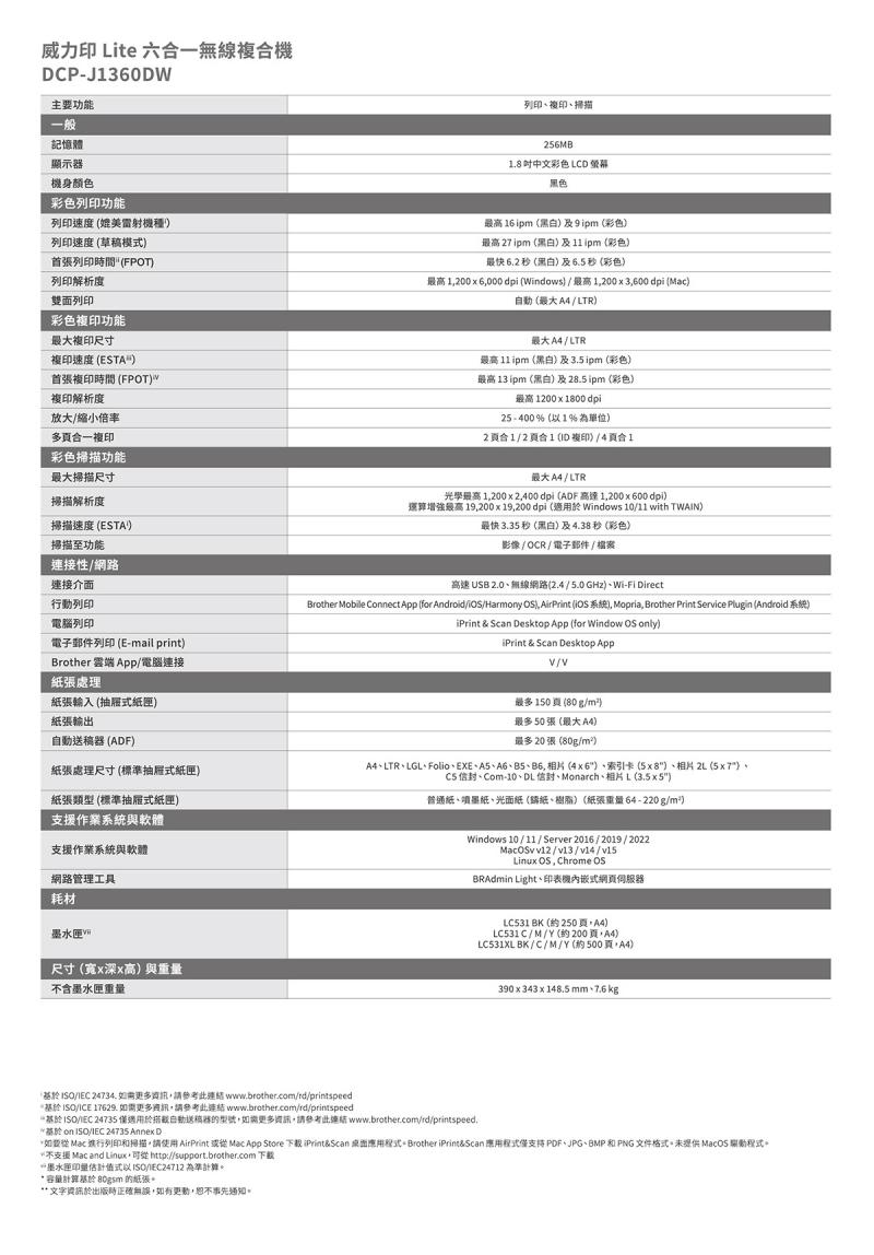 8. 保固起算第一年,Brother 提供免費到府收送服務。DCP-J1360DW 延長保固期限為五年。符合登錄資格所贈送之延長保固只包含主機零件,無免費收送服務。