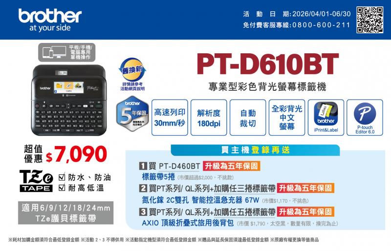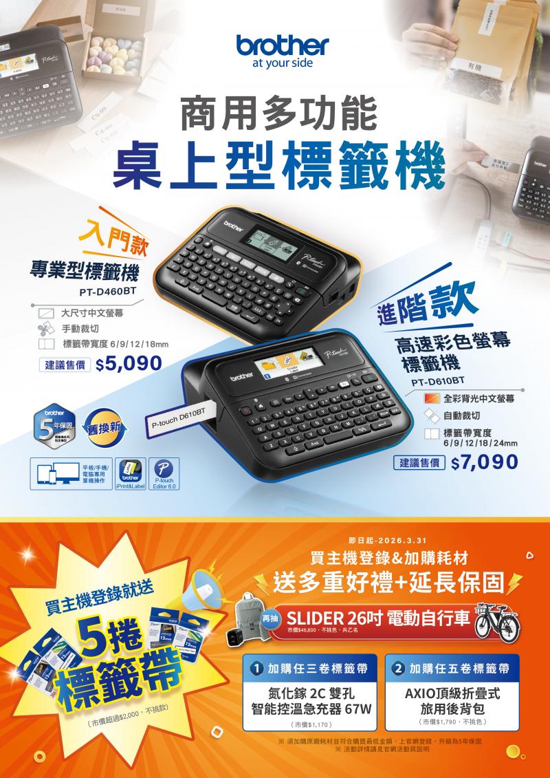 1. 購買 PT-D460BT 或 PT-D610BT,上網登錄就送 5 捲標籤帶(市價超過 NT $2,000)